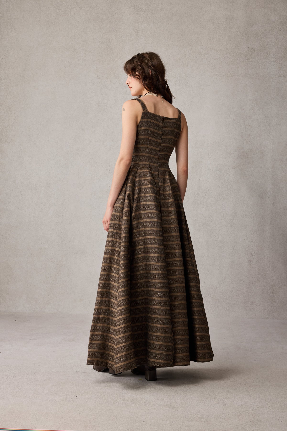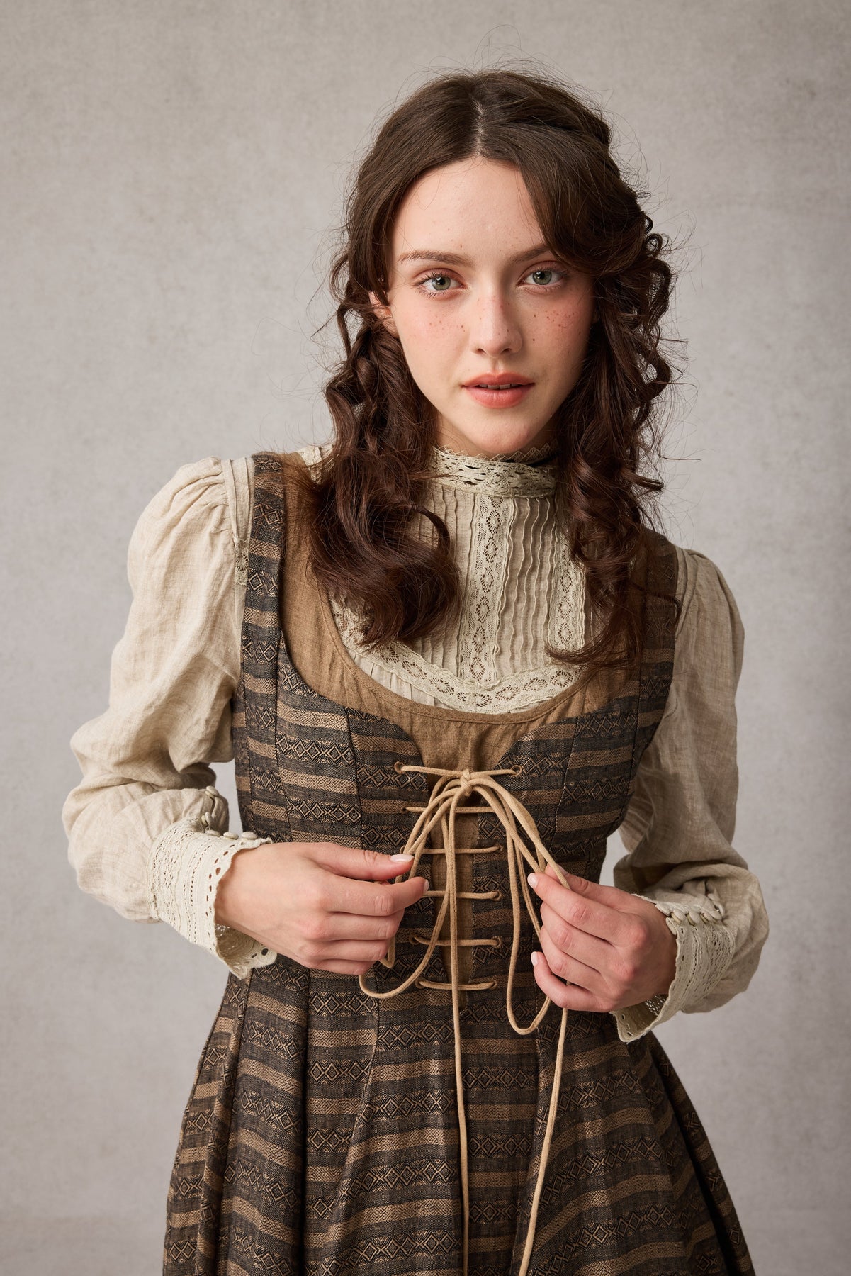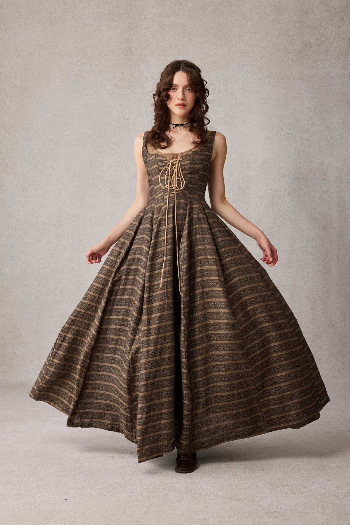We have crafted a clever idea for this dress. It appears to be layered, creating a charming and playful visual effect. The lace-up details add a touch of sophistication to this piece.