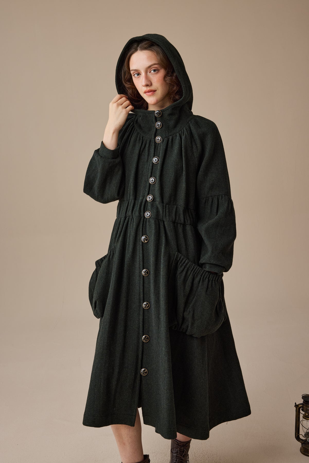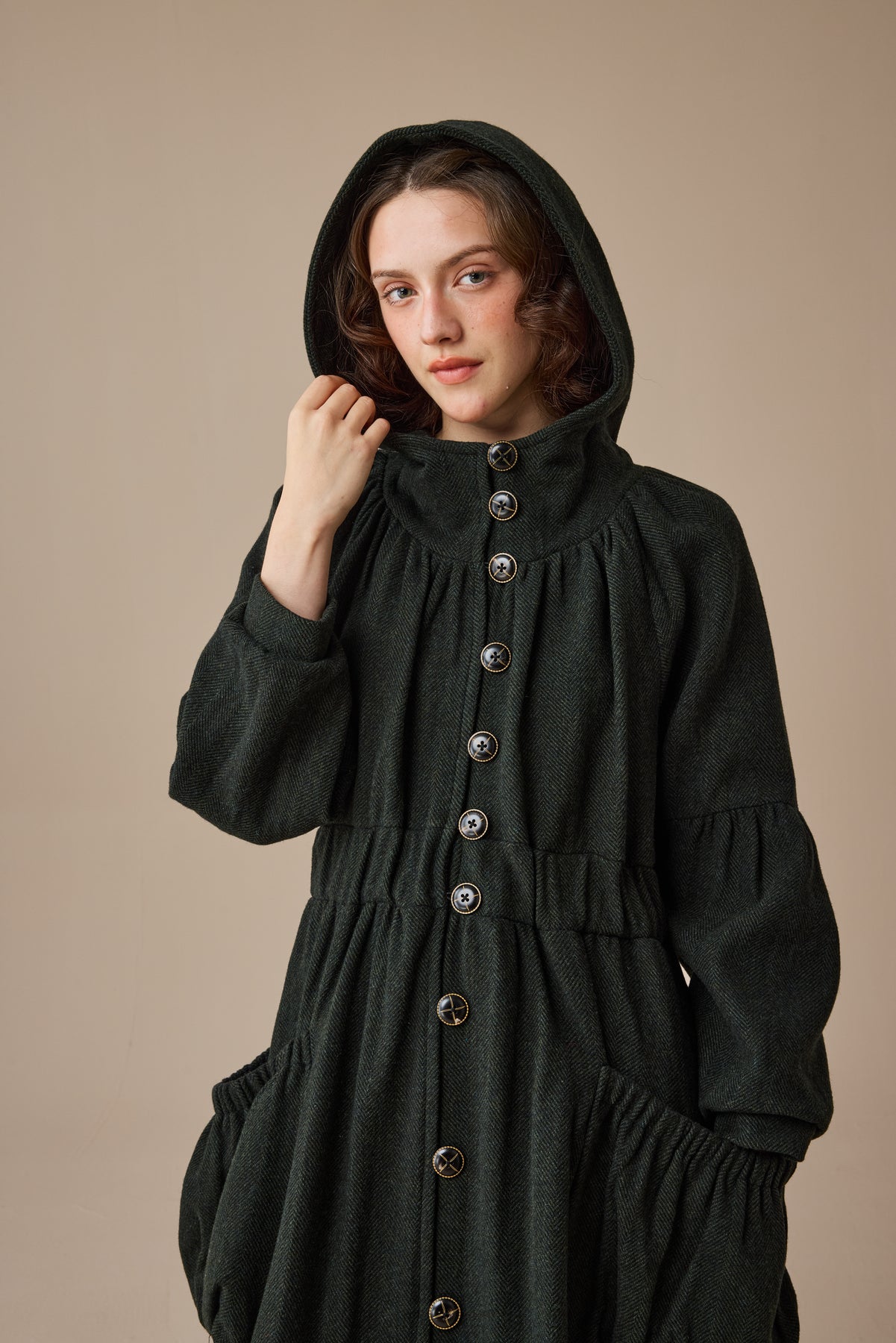 This wool coat draws inspiration from classic designs, skillfully incorporating edgy yet quirky details that lend an understated glamour to every look. It features a structured stand-up collar and hood, an elastic waist, and clever pleating at the cuffs, creating a seamless blend of comfort and Dramatic.
