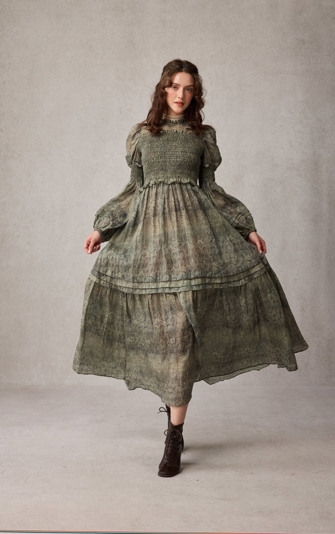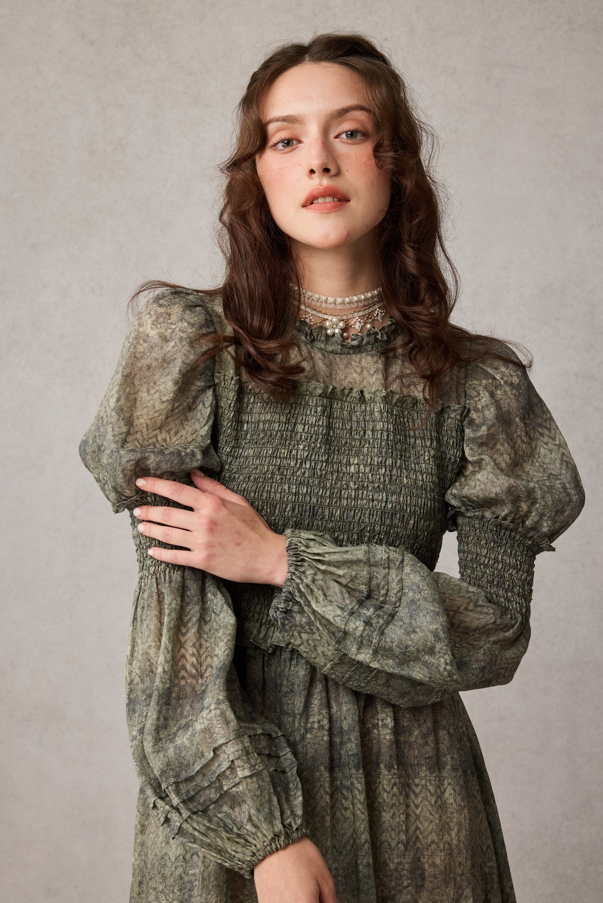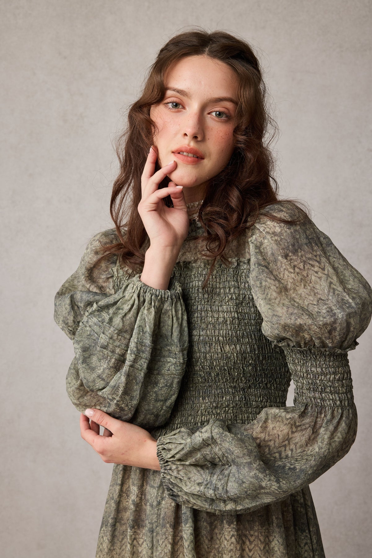 This smocking linen dress takes you back to the elegance of bygone days—it is destined to become a treasured piece in your wardrobe. Delicate hand-pleating, varying shades of linear colors, and multiple artistic inspirations are embodied in this collection: the dreaminess of Monet's Water Lilies, the mystique of paisley, and the regal elegance of royalty. Each pleated piece is meticulously hand-stitched by skilled artisans, ensuring every detail is impeccable.