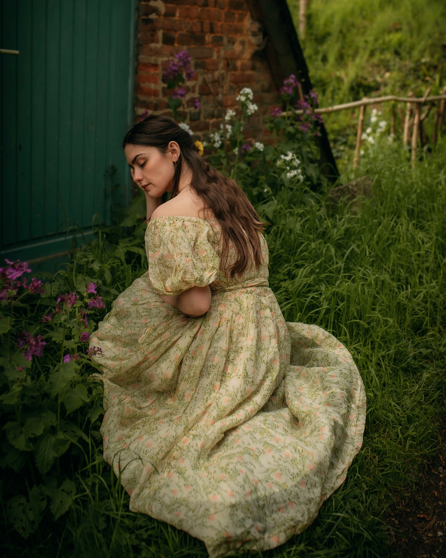 A linen print in the color of wisteria, warm green ivy, tender orange blossoms, and fresh blue roses. These flowers are blooming on your dresses!
