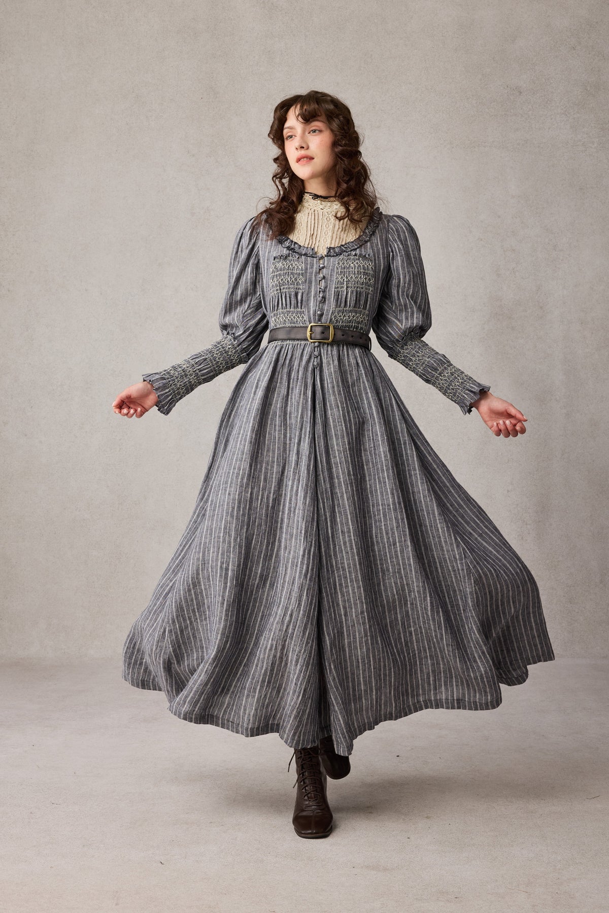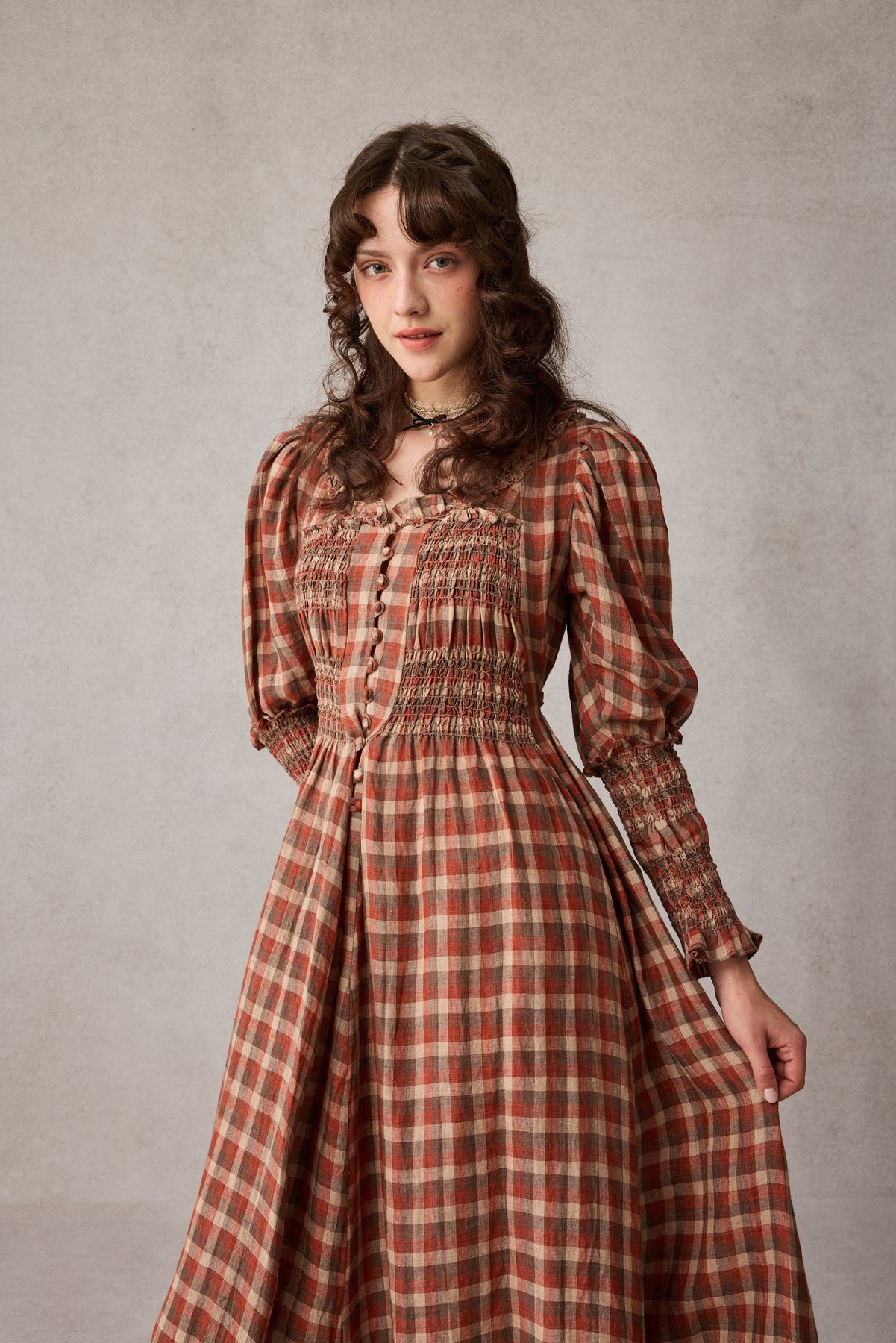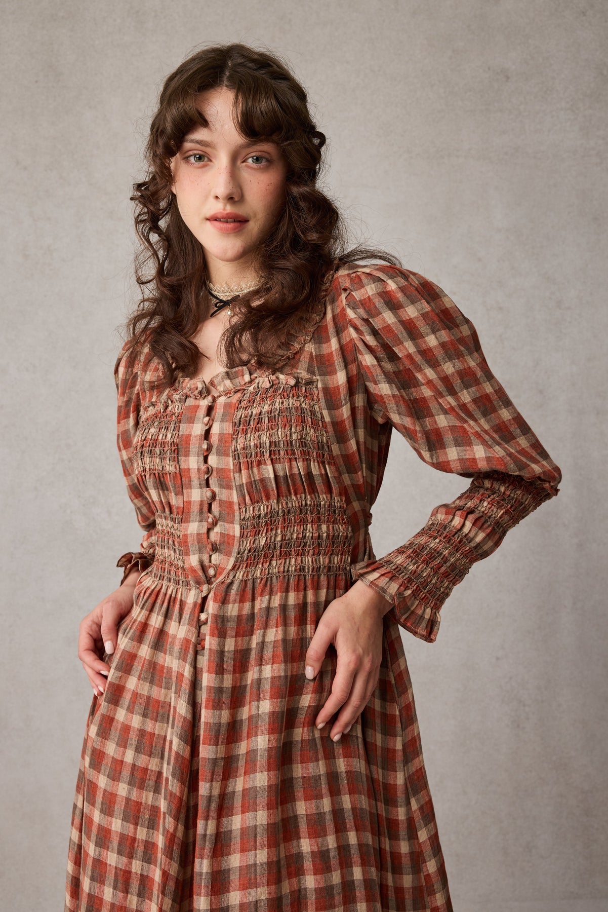This exquisite smocking dress utilizes traditional hand-gathering techniques to create elastic pleats at the bust and cuffs, perfectly contouring to the body. Delicate pleats and ruffle details add an elegant and feminine touch to the look.