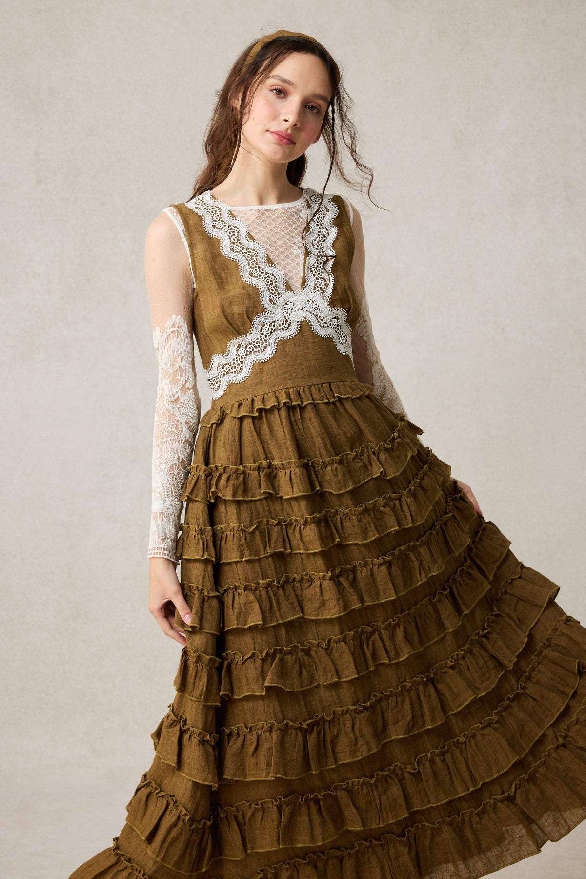 Fall in love with vintage romance. This stunning linen dress is the perfect blend of delicate lace and playful ruffles, designed to make you feel effortlessly enchanting.