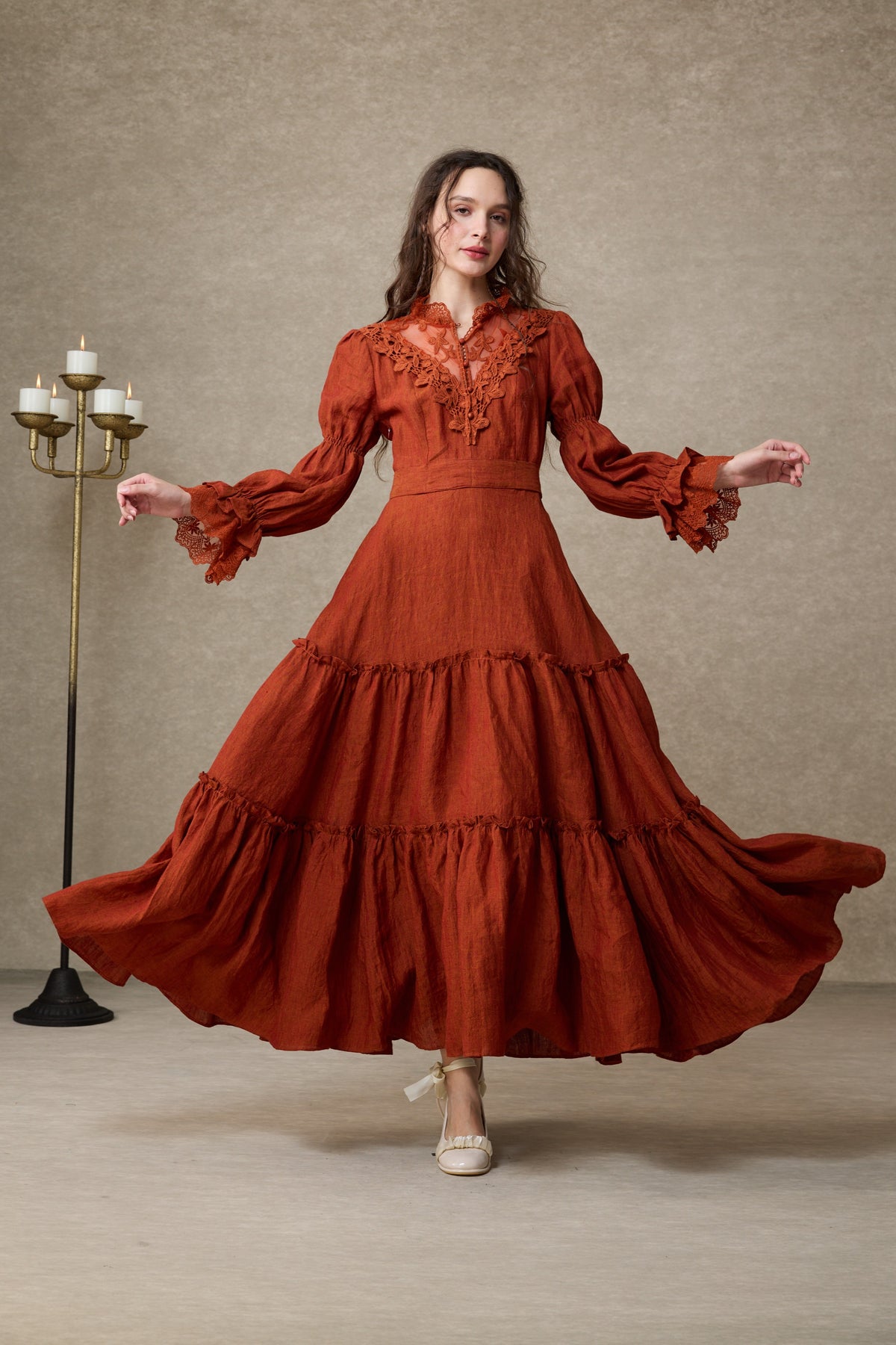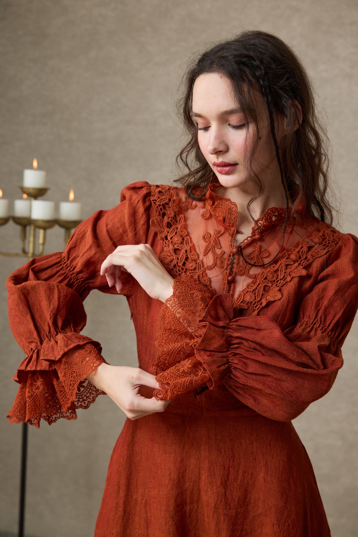 Every detail of this Victorian linen dress tells a story—from the delicate lace to the elegant pleats. We're completely captivated. The voluminous lantern sleeves, cinched at the wrists, adding a touch of poetic drama.