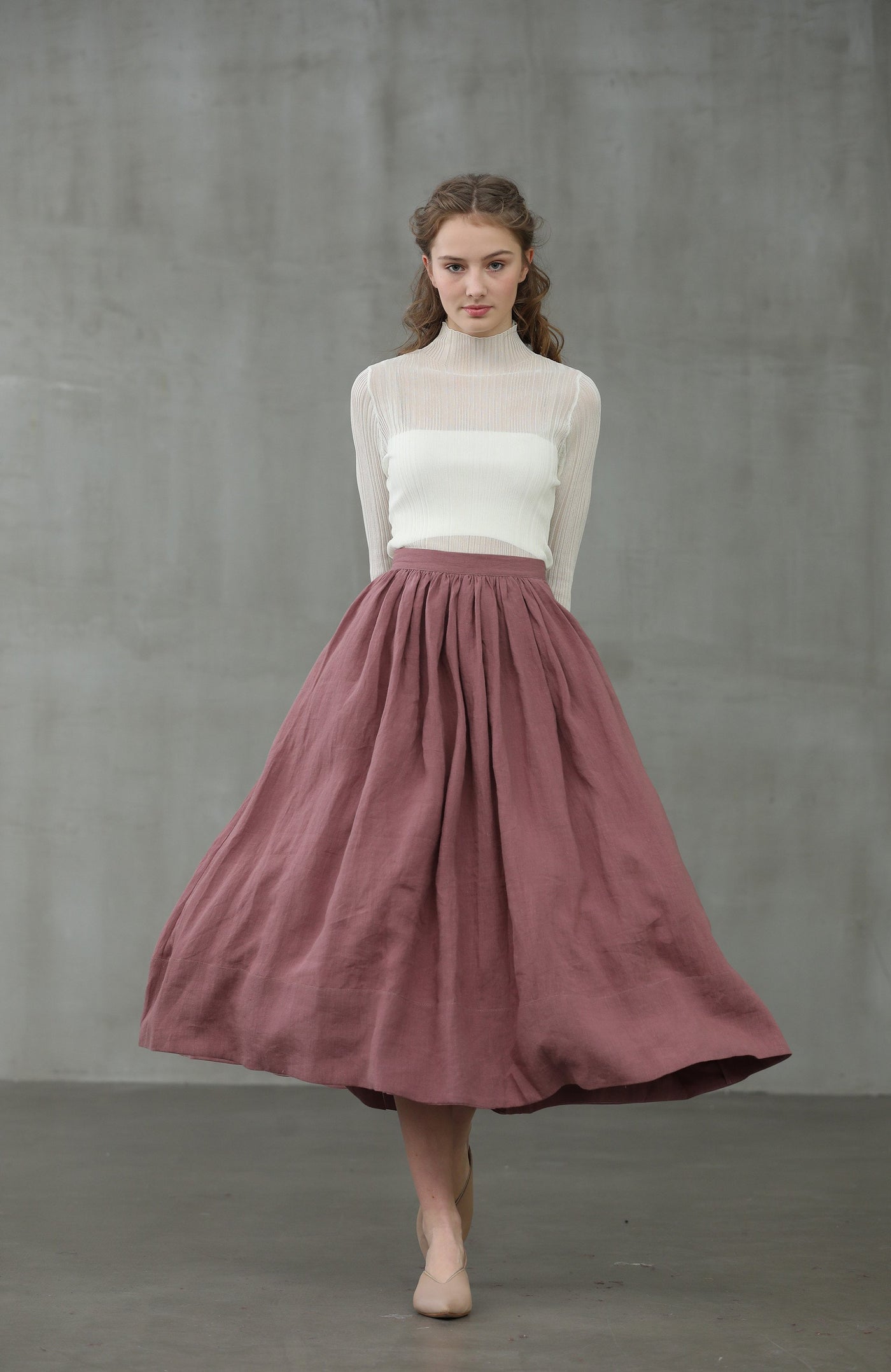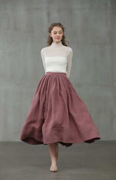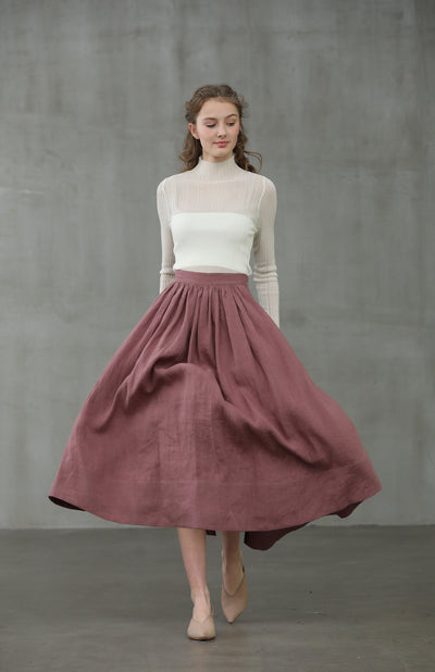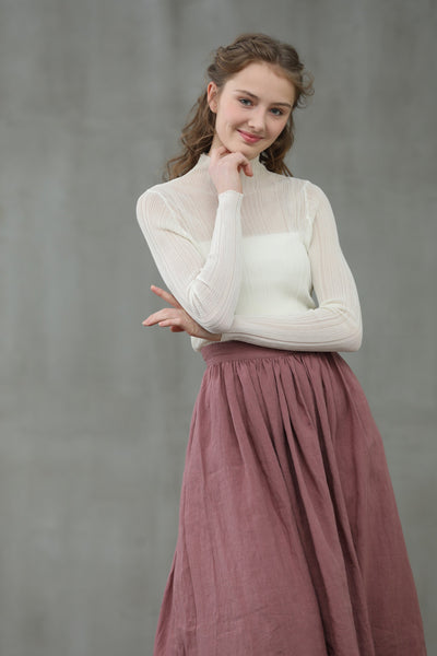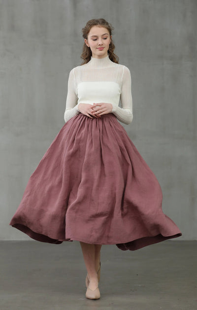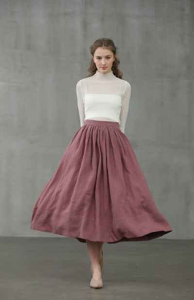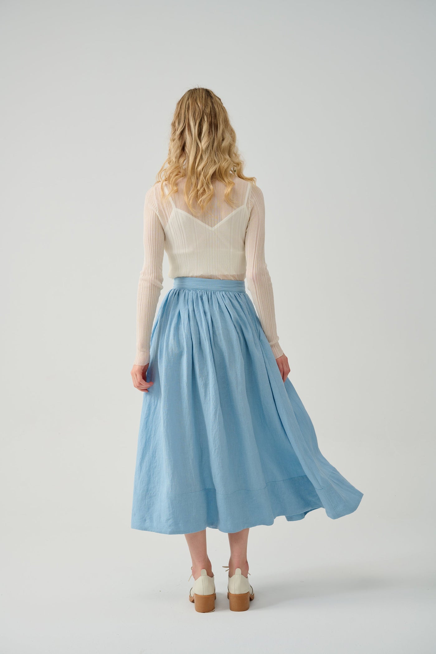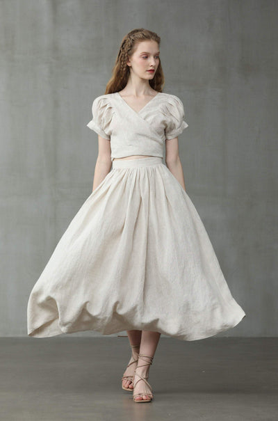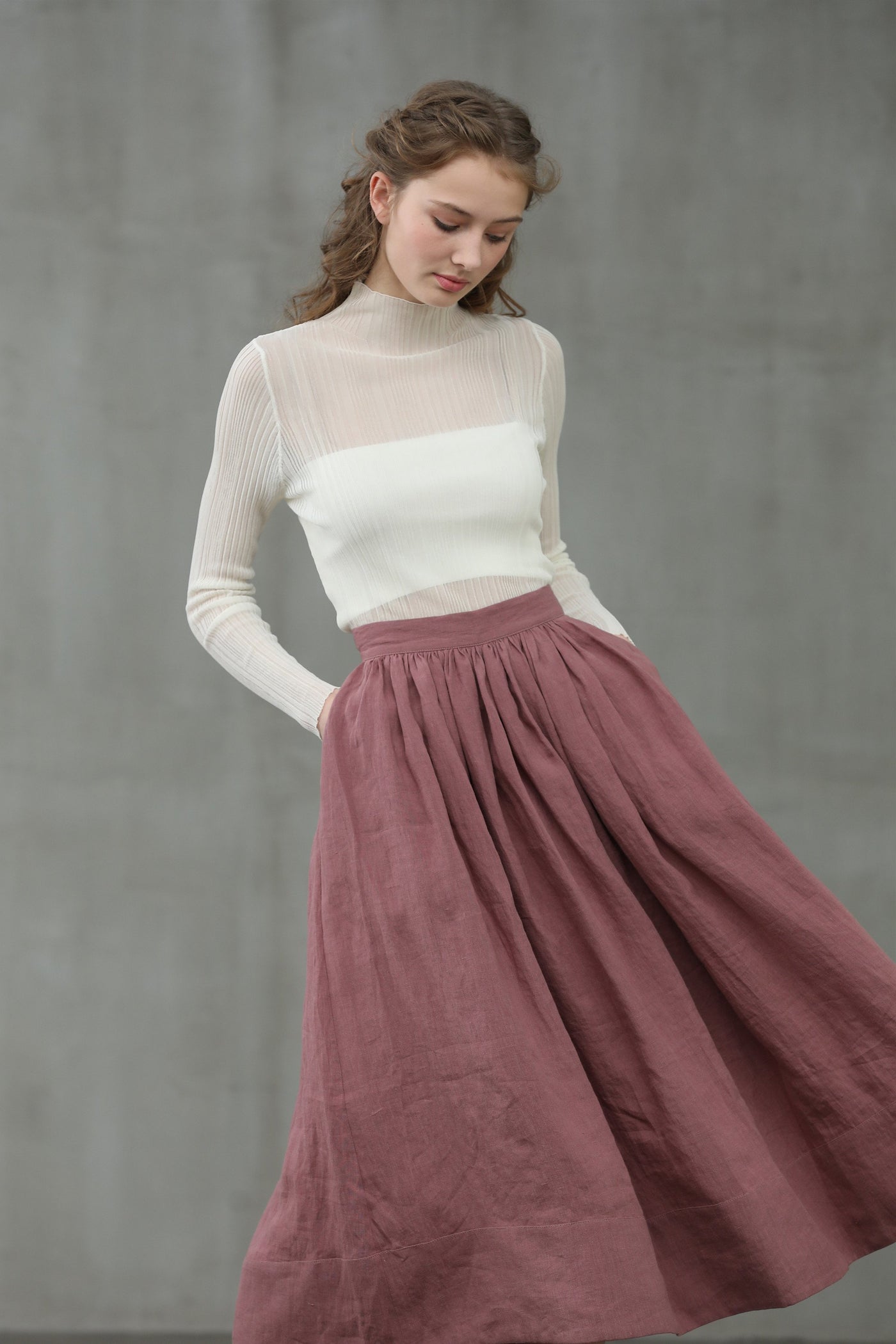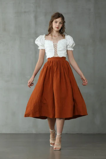 Waistline. Sometimes we feel something was so wrong when we put a skirt on. One of the most important element is the position of its waistline. Our designers have tested and made a few samples in order to set a correct waistline, and also not sacrifice any comfortable feeling that a linen skirt should be. Comfortable first. Our skirts now have 6 sizes ( to fit waist around 68 cm-95cm) Do you need other sizes too?
