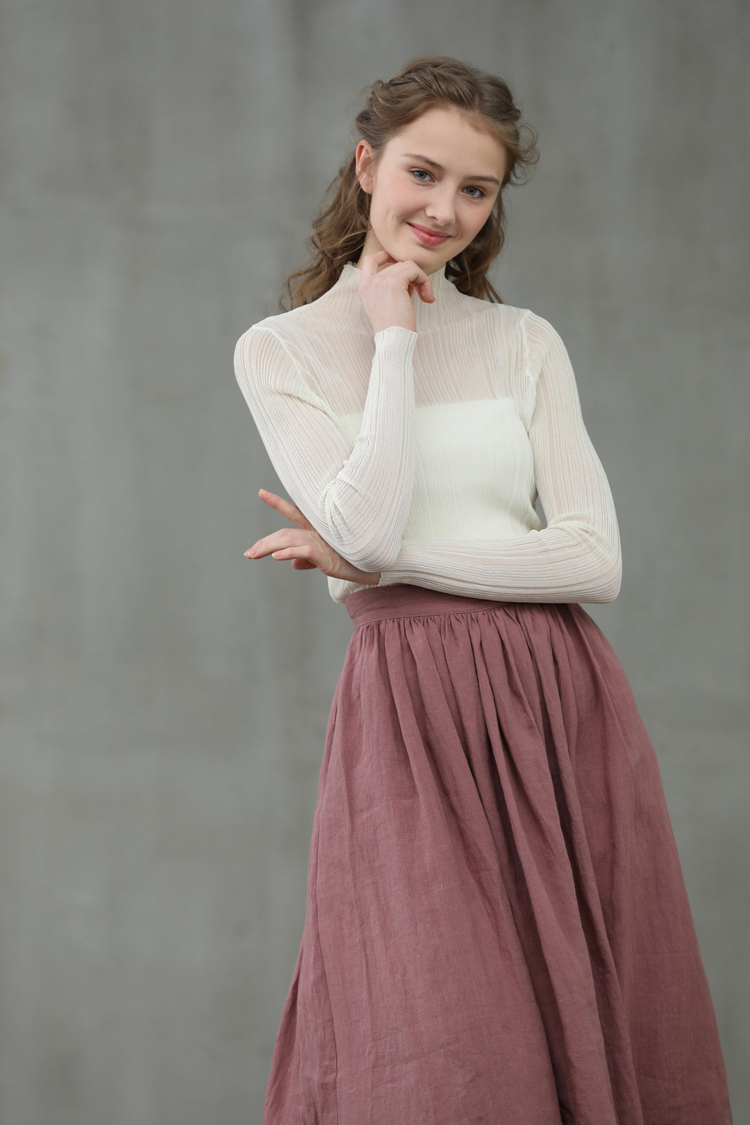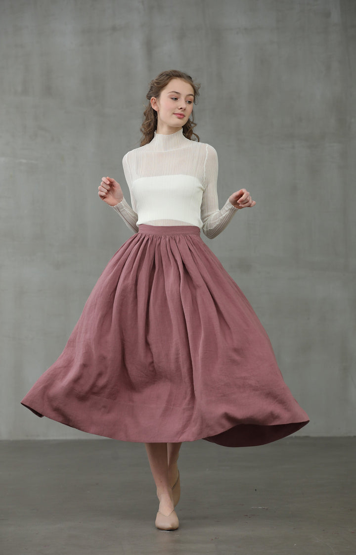 Waistline. Sometimes we feel something was so wrong when we put a skirt on. One of the most important element is the position of its waistline. Our designers have tested and made a few samples in order to set a correct waistline, and also not sacrifice any comfortable feeling that a linen skirt should be. Comfortable first. Our skirts now have 6 sizes ( to fit waist around 68 cm-95cm) Do you need other sizes too?