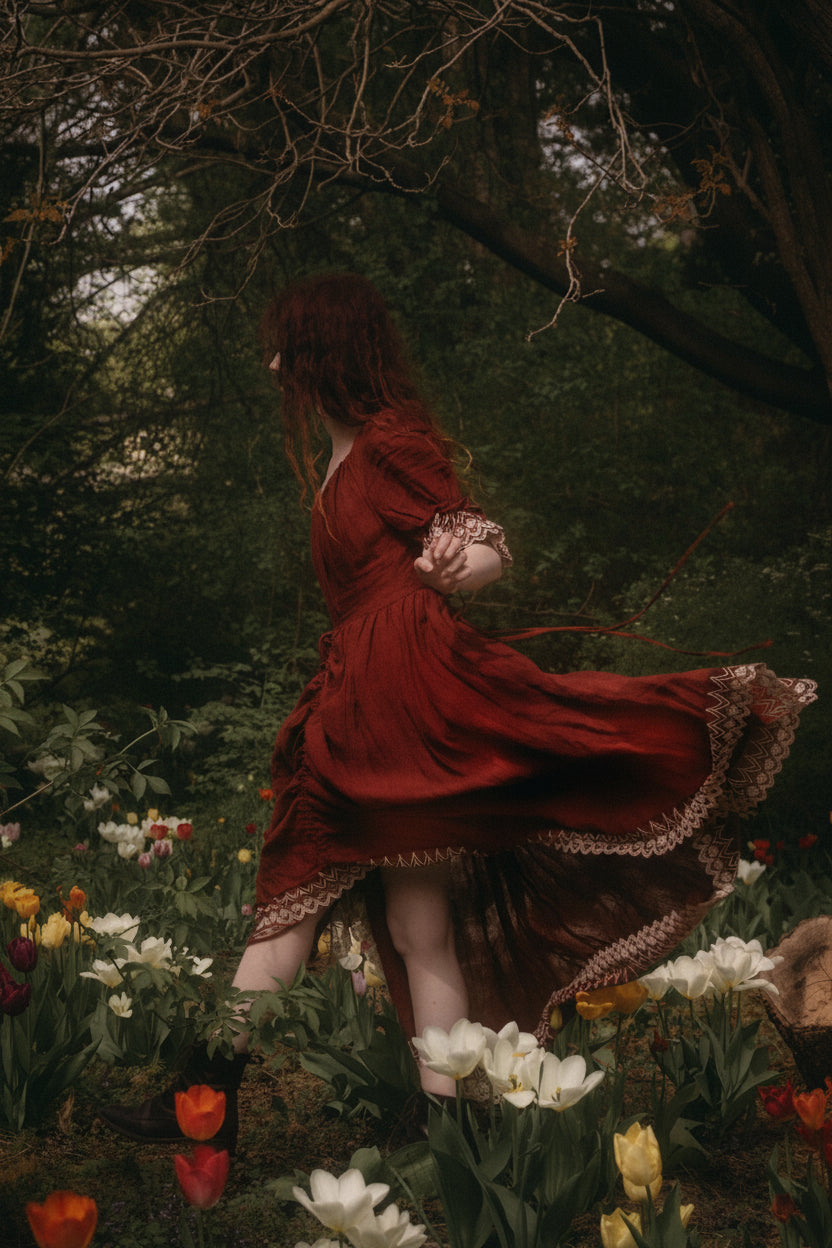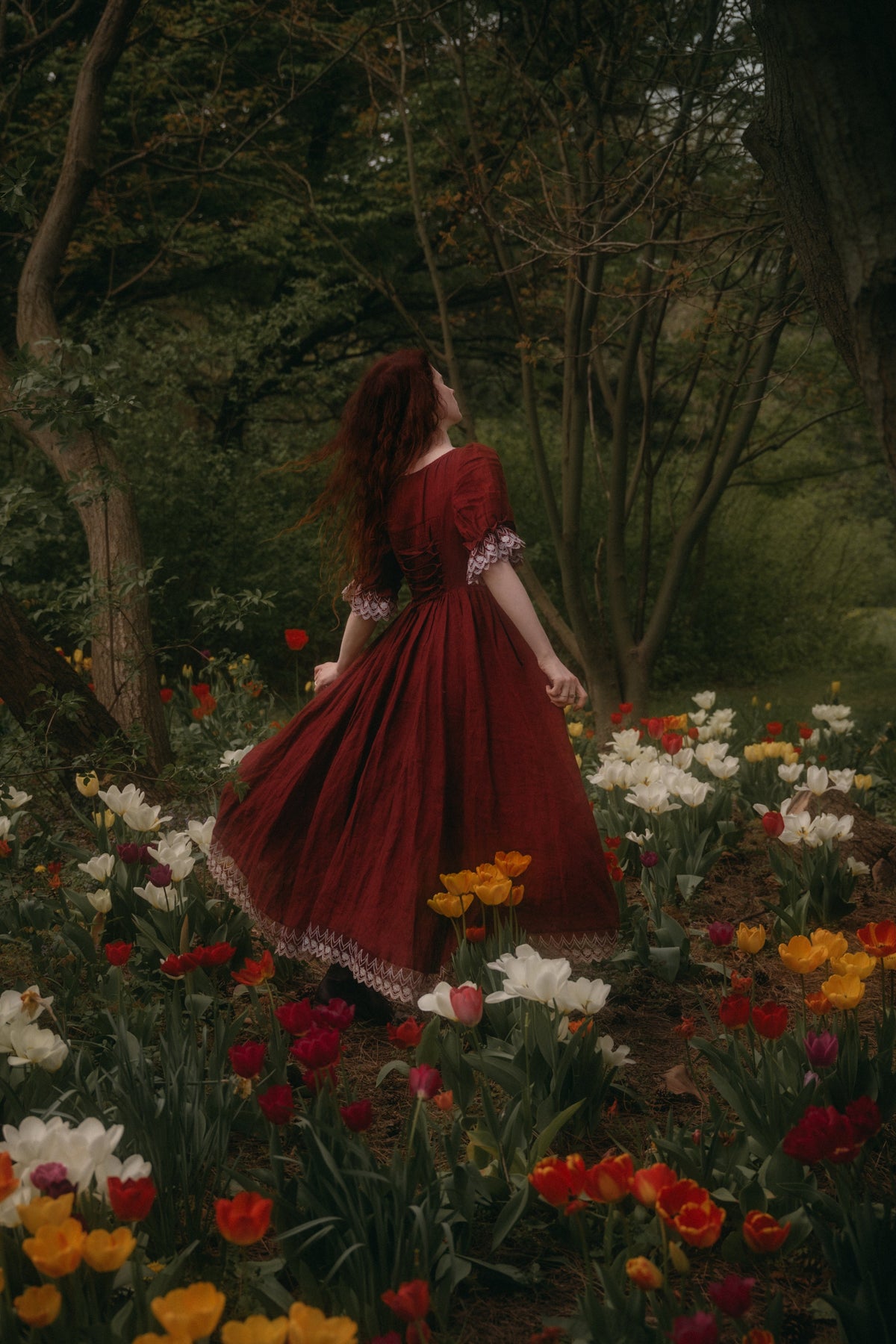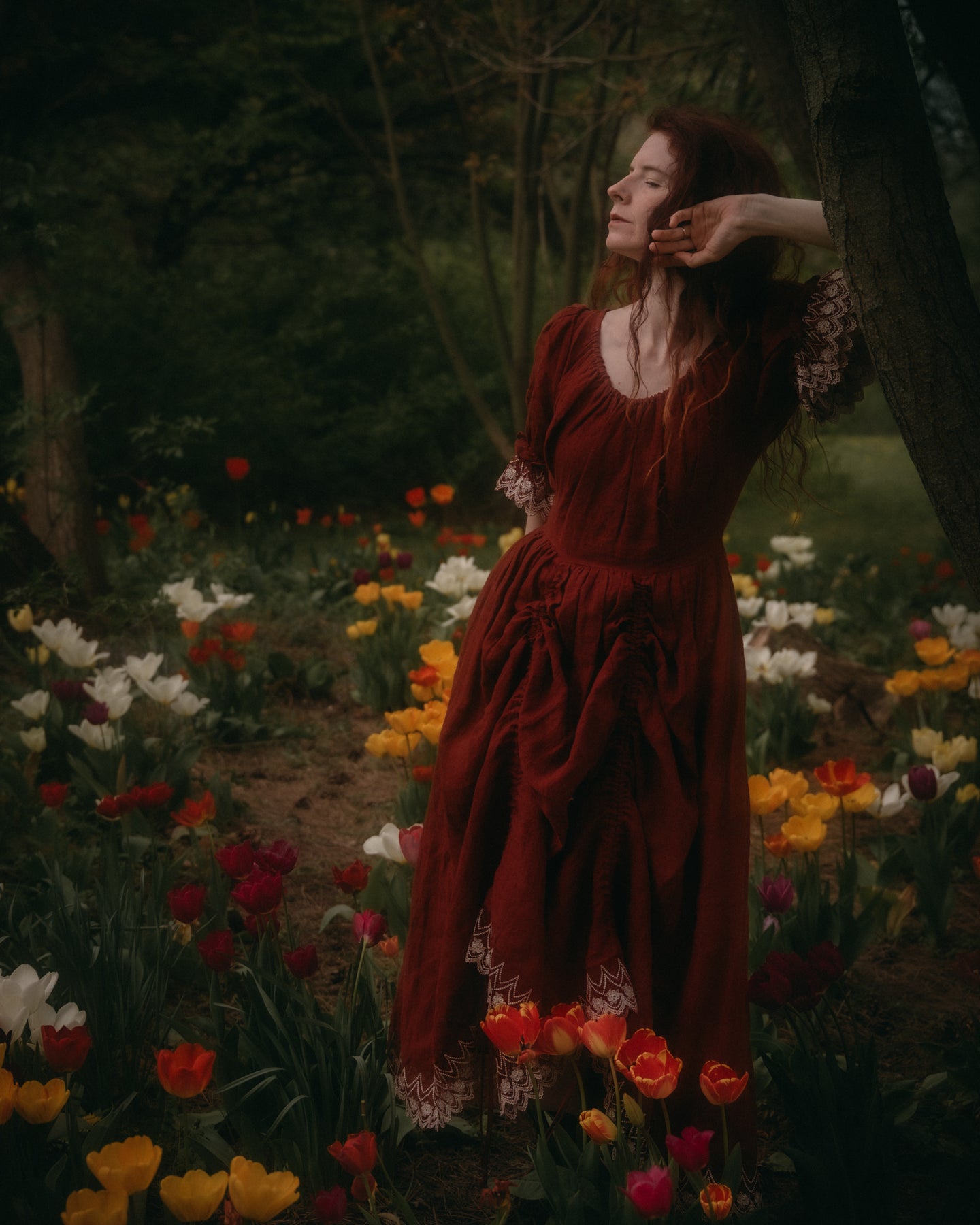 This particular dress takes inspiration from medieval elements, but overall is fantasy in design. Reminds us of afternoons spent in the shade of our favorite tree, swimming in the local lake, or going for a stroll along a mossy riverbank.