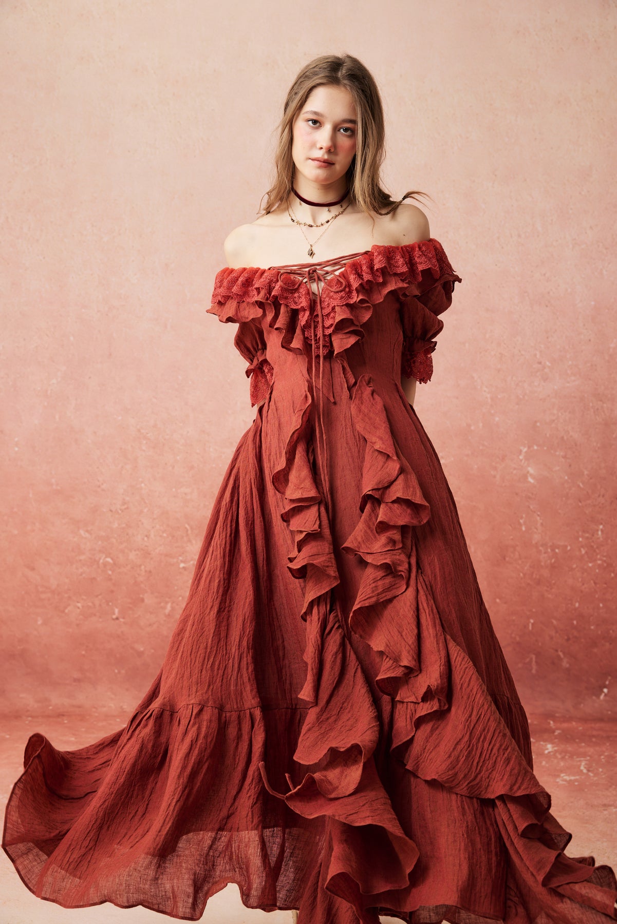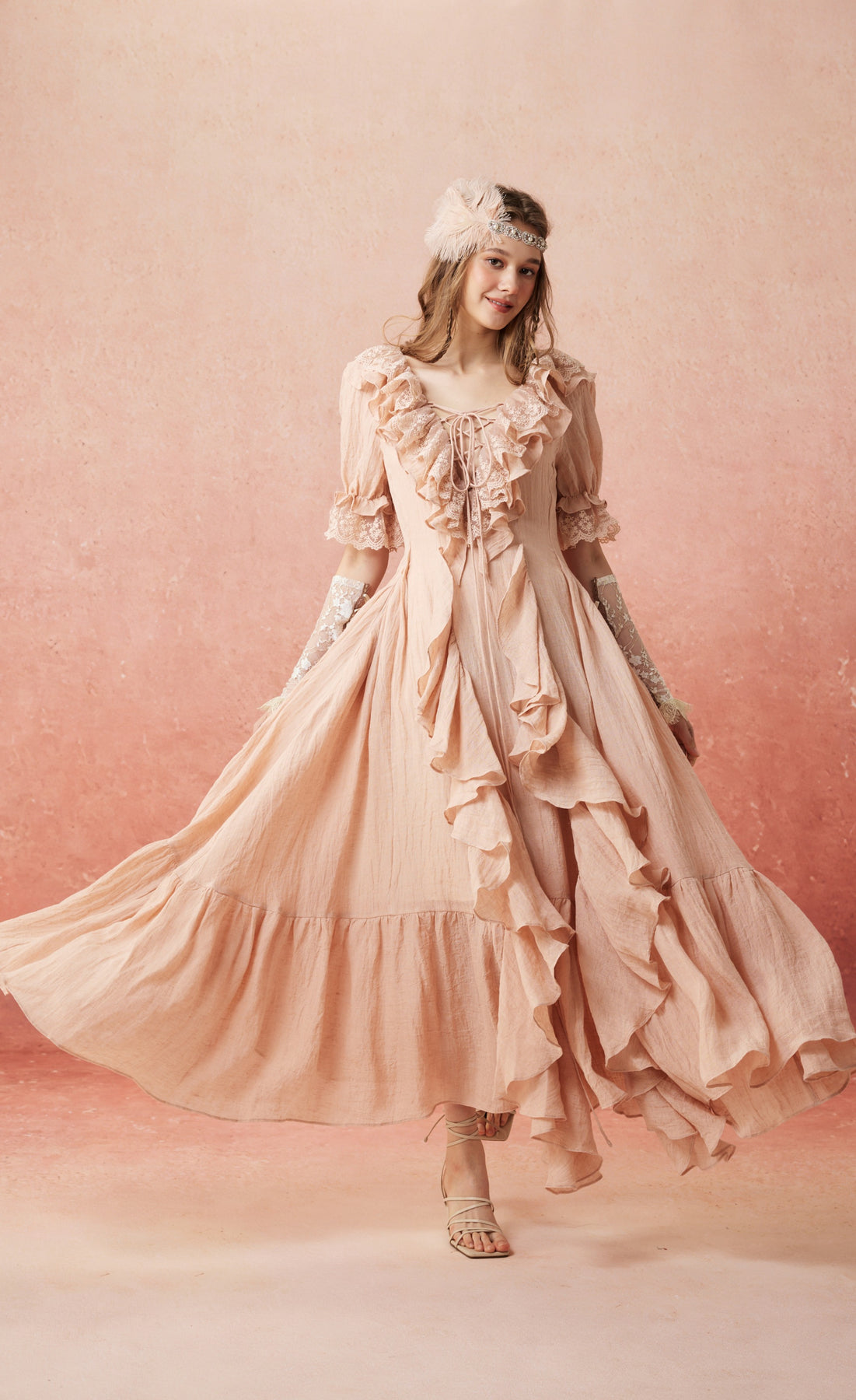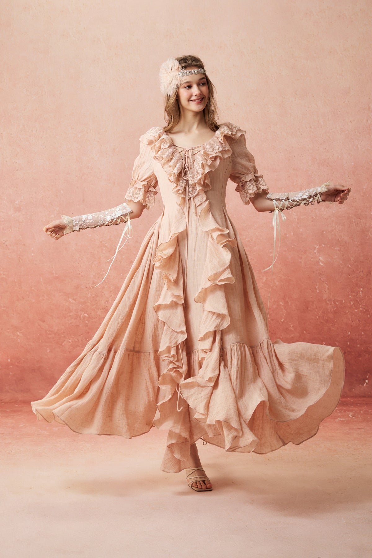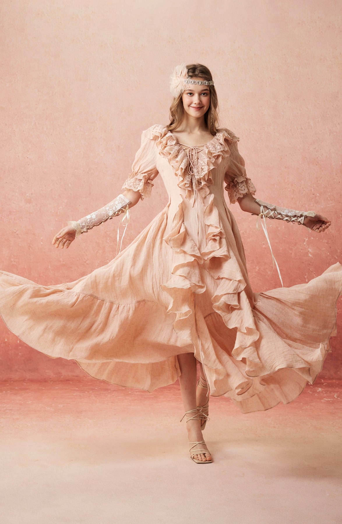 Flowing ruffles cascade from neckline to hem, each layer adding a touch of ethereal elegance. Crafted from breathable linen and delicate cotton lace, it blends vintage charm with modern comfort, turning everyday moments into timeless scenes.